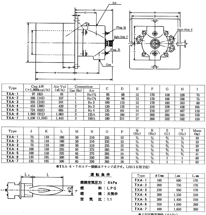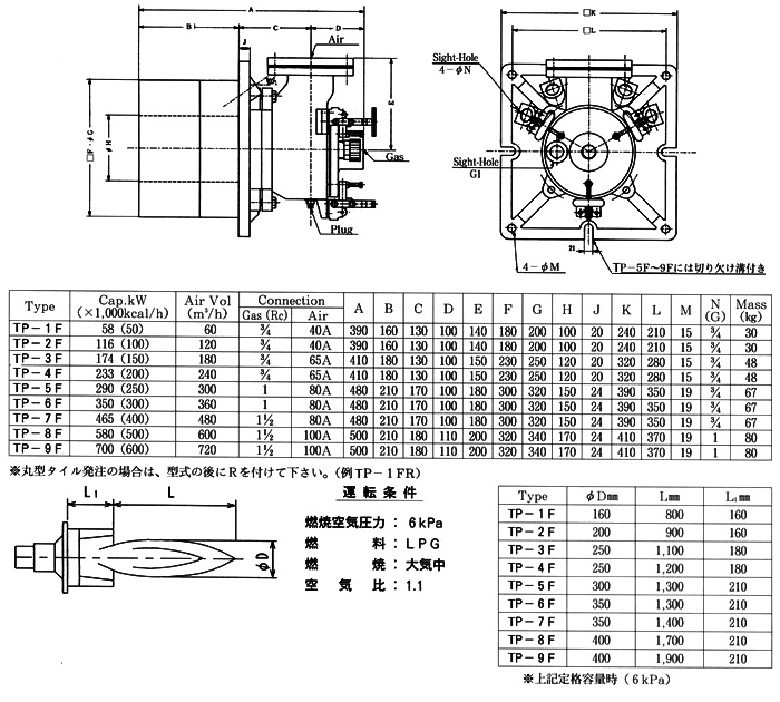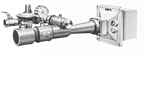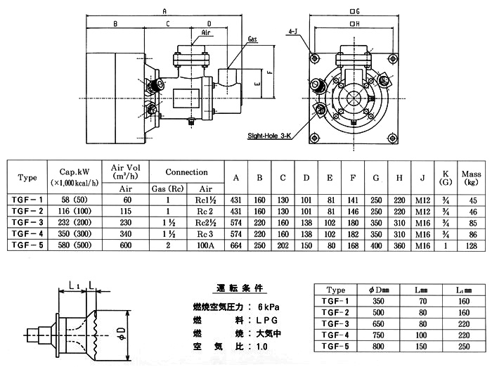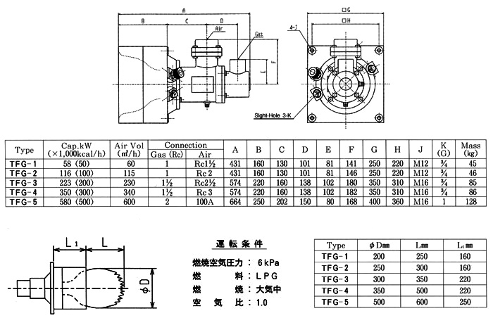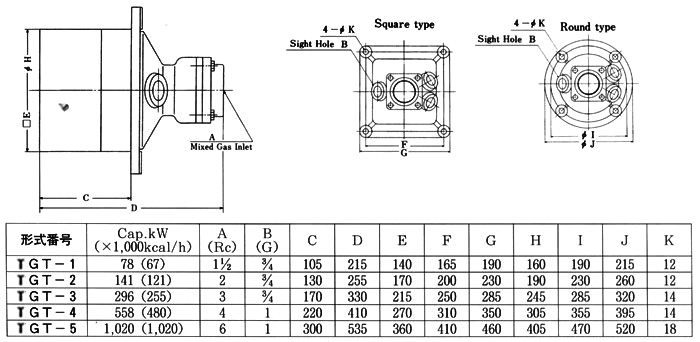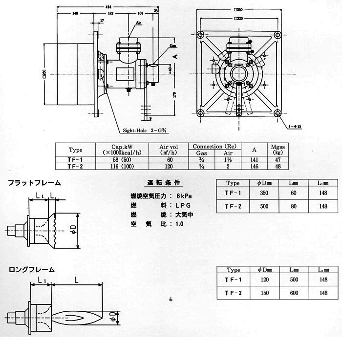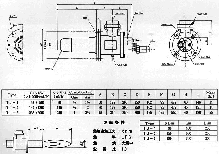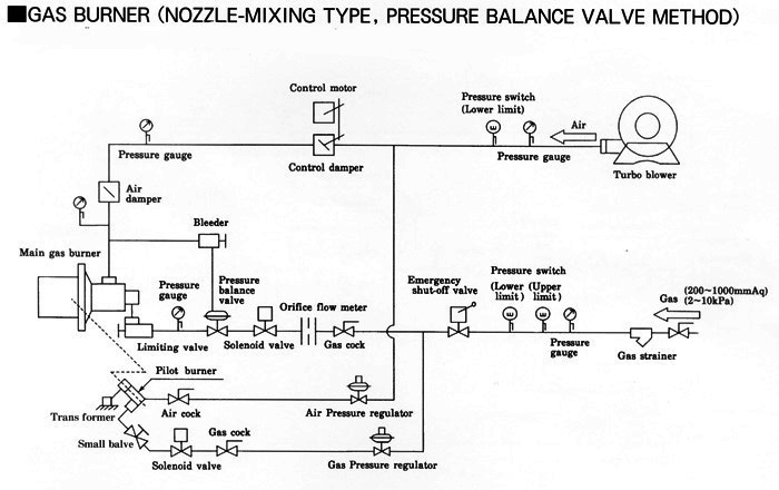 Nozzle-mixing type burner. Very stable combustion can be obtained even if with excess air. As high-speed combustion mixes fluids in the furnace, heating is uniform. Further, a high turndown ratio is so bigh that it is possible to regulate the control of temperature to the extent of low temperature.